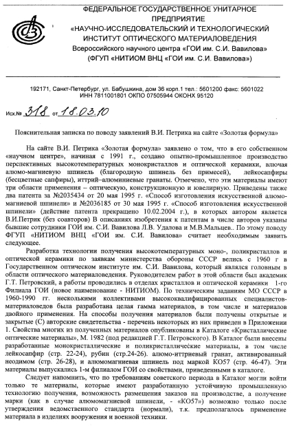«ГОИ им. С.И. Вавилова» по поводу заявлений В.И. Петрика на его сайте